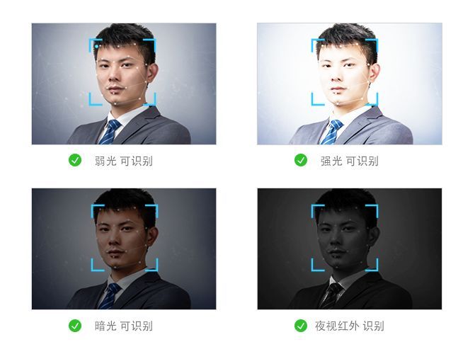 為了應付復雜的環(huán)境,采用的人臉識別技術一定要支持強光、弱光、黑夜背光等多種復雜環(huán)境,并且可以檢測出正臉、側臉等多