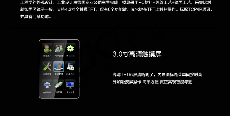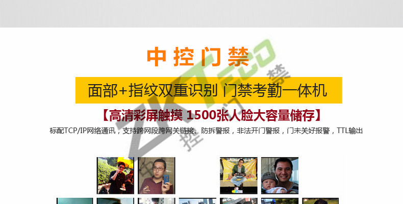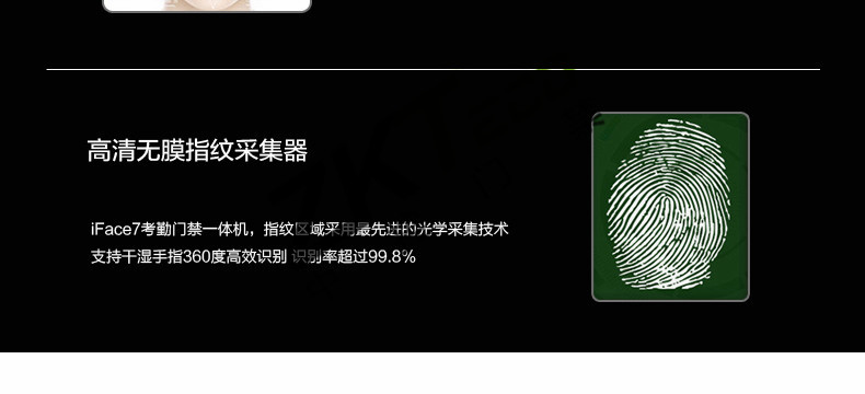 面部門禁一體機iFace7是基于ZEM800多媒體開發平臺設計的一款集指紋和面部混合驗證的3寸觸摸彩屏門禁終端,采用ZKFinger VX10.0最新指紋算法及ZKFace VX7.0面部算法,識別速度快,靈活選擇面部、指紋或者密碼開門方式,集成高分辨率夜市紅外和雙攝像頭功能,適應范圍廣。支持高級門禁功能(不同時間段開門,多人開門,拆機報警,門未關好報警,門被非法打開報警,開門按鈕輸入,有限門鈴接口,脅迫報警等)。標配的TCP/IP通訊,支持跨網段跨網關連接,是安防工程的首先產品,可用于銀行、部隊、機場等高安全場所。