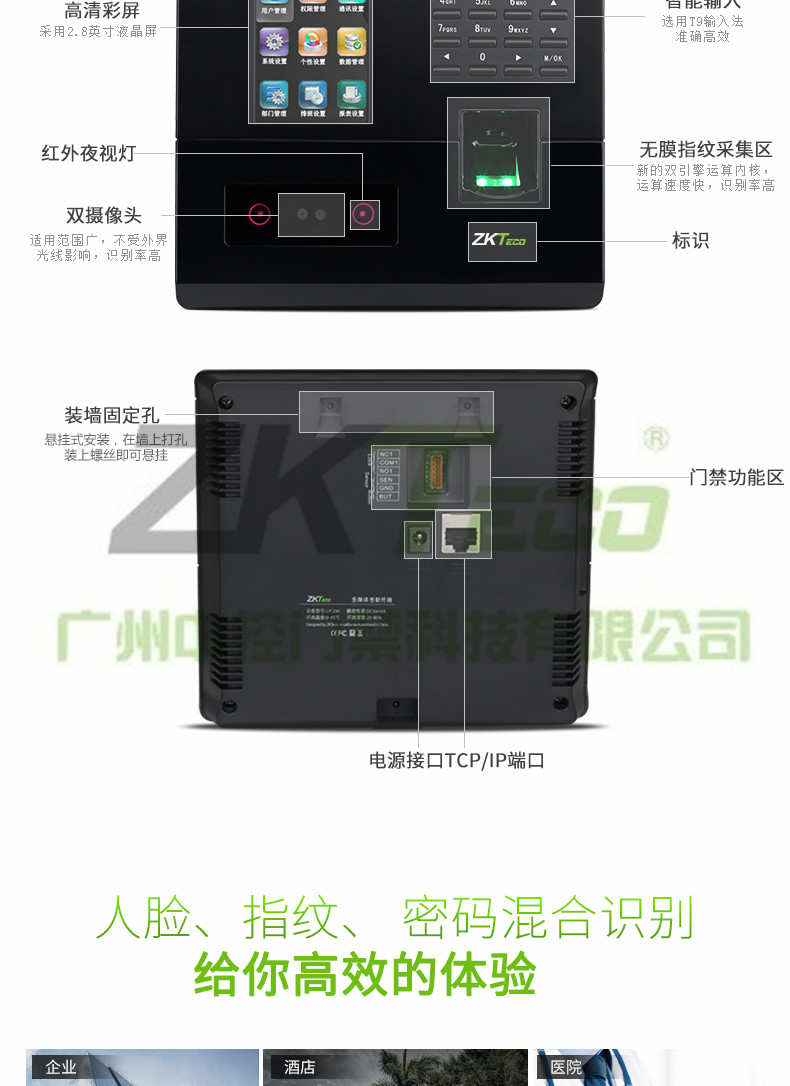 智能密碼門禁UF200特點: 面部容量:200張 指紋容量:400枚 記錄容量:50000條 顯示屏:2.8寸彩屏 考勤速度:小于0.5秒 面部算法:ZKFace VX7.0 U盤功能:U盤上傳下載 考勤照片容量:3000張 通訊方式:USB-Client TCP/IP 其它功能:定時響鈴,9位碼、SSR,簡單門禁功能 輸入法:T9輸入法 電源規(guī)格:DC5V 1A 使用濕度:0%-45% 使用溫度:20°C-60°C 尺寸:168(L)x151.5(W)x30(H)mm