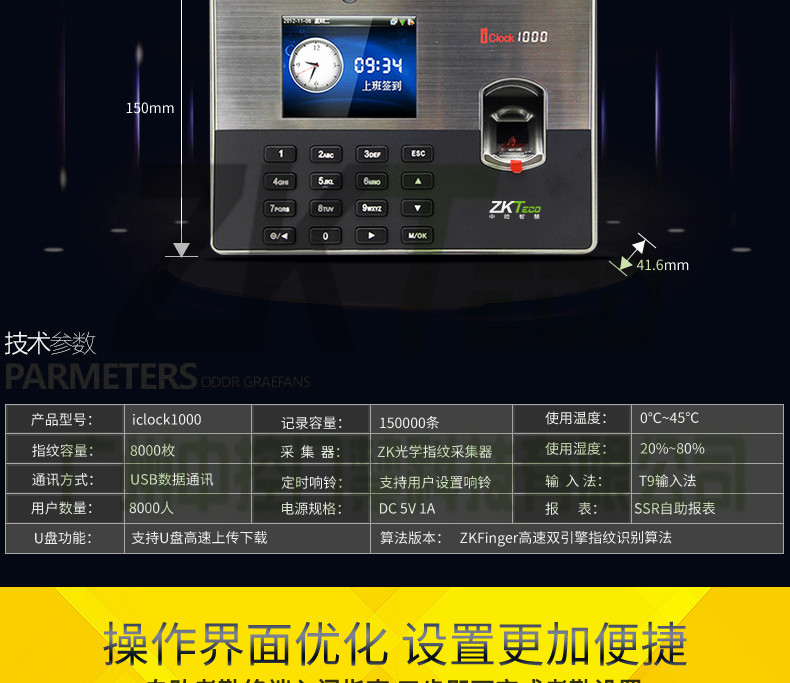 iclock1000是中控科技推出的一款3.5寸彩屏指紋考勤機,該款產(chǎn)品在原來3.5寸彩屏考勤產(chǎn)品的基礎上增加了攝像頭拍照功能,內(nèi)置130萬像素高淸攝像頭,可以輕松實現(xiàn)員工照片拍攝和顯示,標準的TCPP通訊,經(jīng)過∪SB「協(xié)會認證的U盤下載和cien模式通訊,方便得T9輸入法,對公對私的短消息功能、用戶可自走義的走時響鈴和其高貴典雅的外觀設計,可選配MF、GPRS無線通訊,適合100-500人考勤管理。